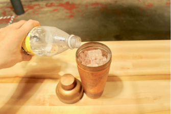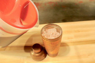 If you have a cocktail shaker fantastic, fill it with ice. If not this drink can still be made in any glass by stirring instead of shaking.