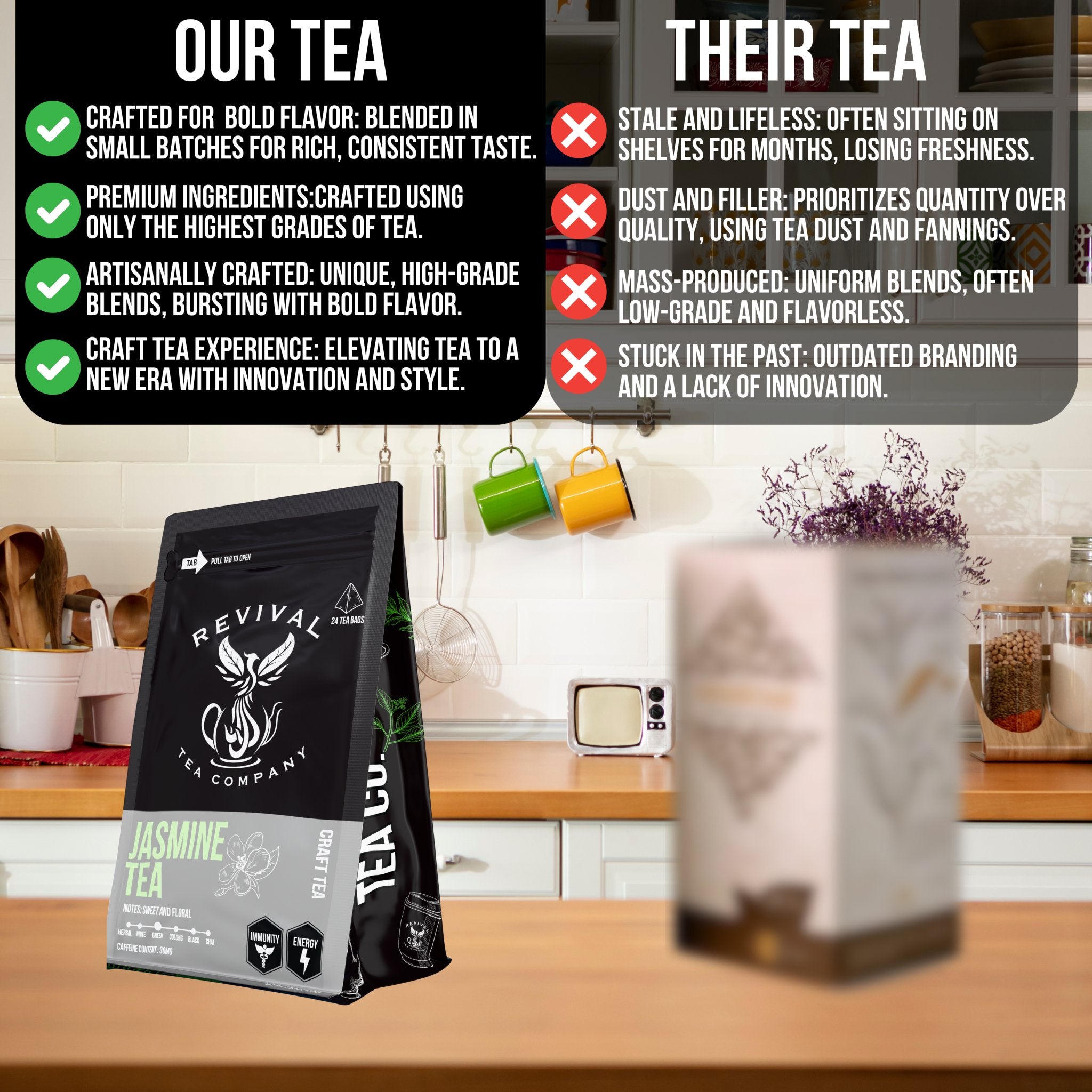 Discover the Difference: Elevate your tea ritual with our Jasmine Tea and experience the bold flavors of Revival Tea Company. Treat yourself to the enchanting taste of jasmine-infused tea and embark on a journey of floral bliss and tranquility.